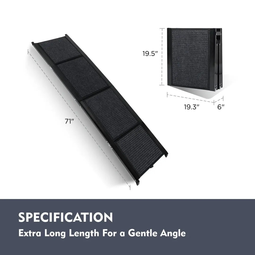 • 【 Four-Fold for Portability & Multifunctional 】: The dog ramp with extra long length of 71" and a width of 19.5". Unlike other dog loading ramps on the market can only be two-fold or three-fold, our dog vehicle ramps can be quadruple folded into a convenient size of 19.3"x19.5"x6". The dog ramp stair is perfect for your dog's entering cars, SUVs, trucks, high beds, and couches