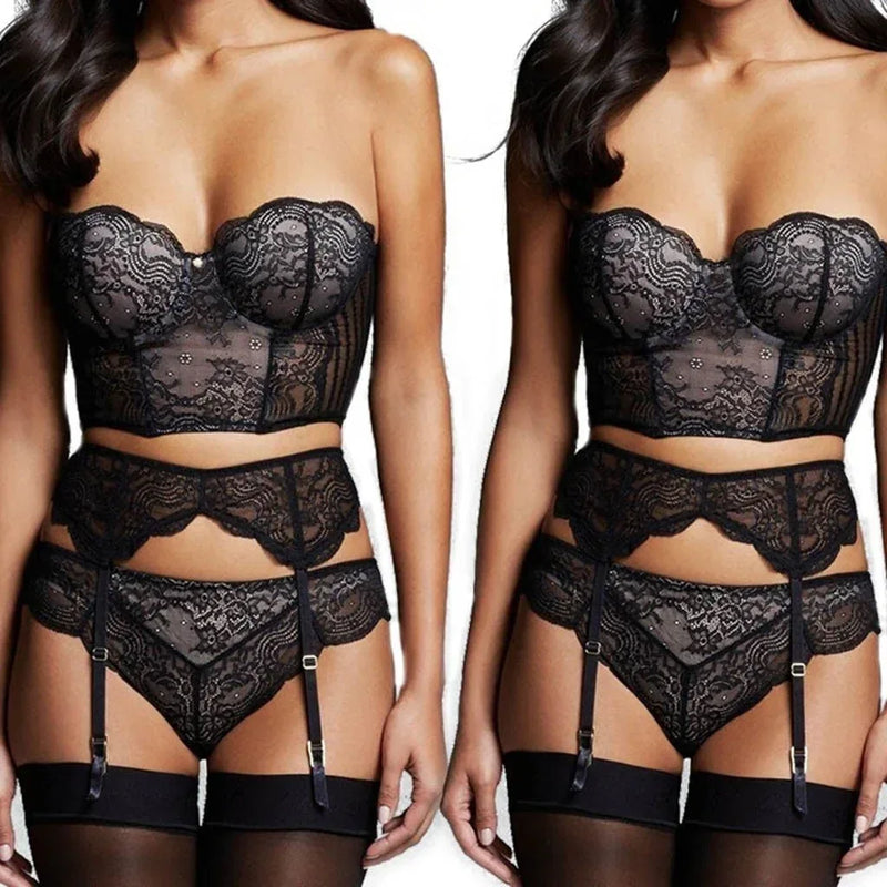 This lace underwear contains Bra, garter, and panties, which can be worn at will, with good elasticity, No steel ring and chest pad,soft and comfortable.