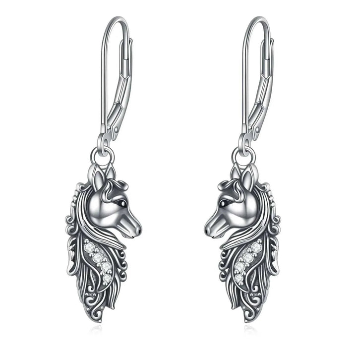 925 Sterling Silver Horse Earrings - Dangle Drop Leverback with Zircon
