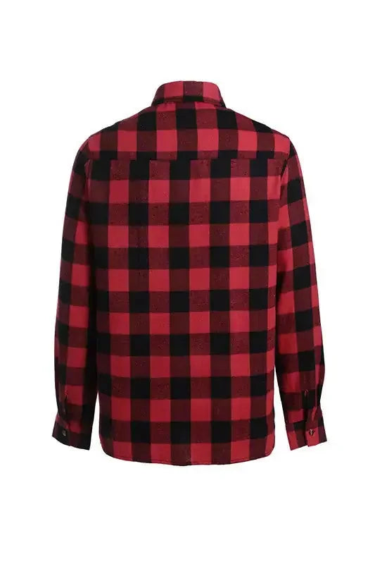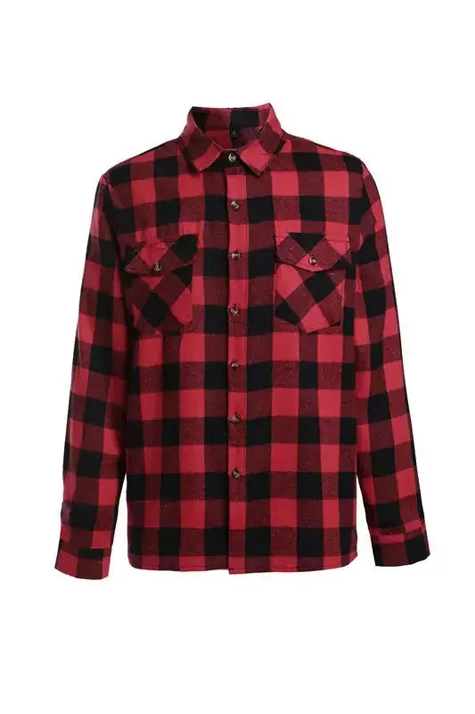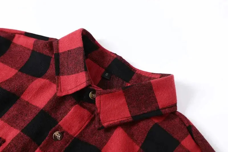 This men's shirt features the classic checkered pattern. The red and black checkered pattern is both retro and fashionable, representing a fusion design of American casual style and retro style. The shirt features a lapel design and is paired with buttons of different colors, adding a sense of refinement and retro charm. The design of the double chest pockets is a manifestation of the workwear style. It not only enriches the visual layers but also is practical. The overall fit is form-fitting, which can well outline the wearer's body lines, showing a neat and capable temperament, while also retaining the comfort and casualness of a casual shirt.