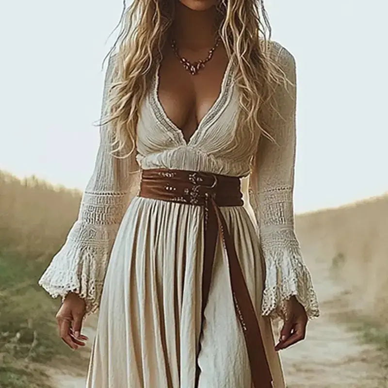 Boho Chic Maxi Dress, Women's Vintage-Inspired Lace Trim With Deep V-Neck Elegant Dress, No Belt Included