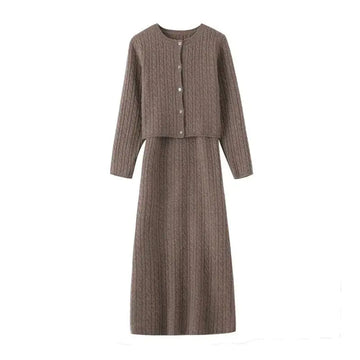 Embrace effortless style with our Knitted Small Twisted Cashmere Cardigan and Suspenders Skirt set. This cozy two-piece suit, crafted from soft, luxurious cashmere, offers a perfect blend of comfort and chic. The textured knit adds a touch.