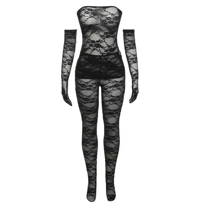 "Step into elegance with our lace tube top suit, a women’s fashion set featuring a high waist tight pants design. This lace tube top suit combines a delicate lace top with a sleek body stocking style, perfect for making a bold statement. Ideal for standout looks, this lace tube top suit offers a flattering fit and chic versatility for any occasion."